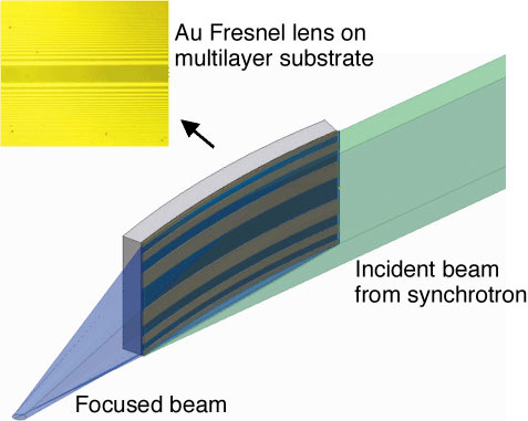 Fig. 122: Illustration of a multilayer Bragg-Fresnel lens made of Au Fresnel zones deposited on a multilayer substrate, which is bent to produce horizontal focusing; (inset) an optical micrograph of the Au Fresnel zones on the prototype lens. |