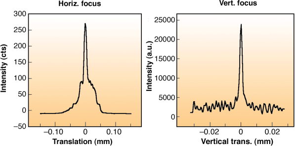 Fig. 123: Horizontal (left) and vertical (right) intensity profiles across the focused beam. The horizontal focus was measured with a 5 µm aperture whereas the vertical focus profile was derived from a knife-edge scan. |