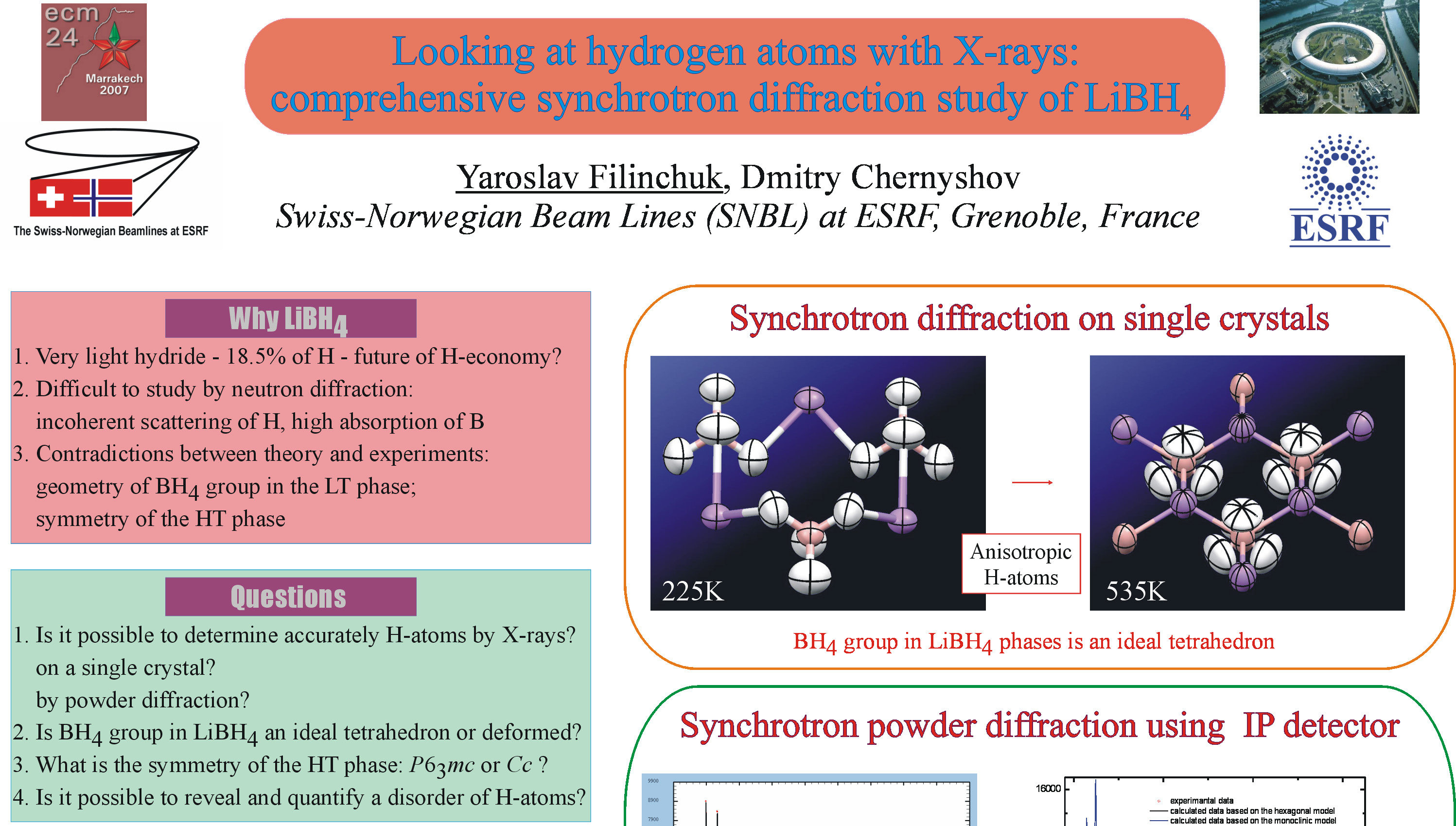 In the presentation, B-H distances will be compared with those obtained from DFT calculations and from neutron powder diffraction study of triply isotopically substituted 7Li11BD4 [3]. Libration corrections and displacement of the electron cloud relative to an average nuclear position of an H-atom will be discussed. Positions of H-atoms and structural changes in LiBH4 were tracked by synchrotron powder diffraction from 80 to 400K with ~1K step. These results and results of combined Raman spectroscopy / powder diffraction study using a fast-readout CCD detector will also be presented.