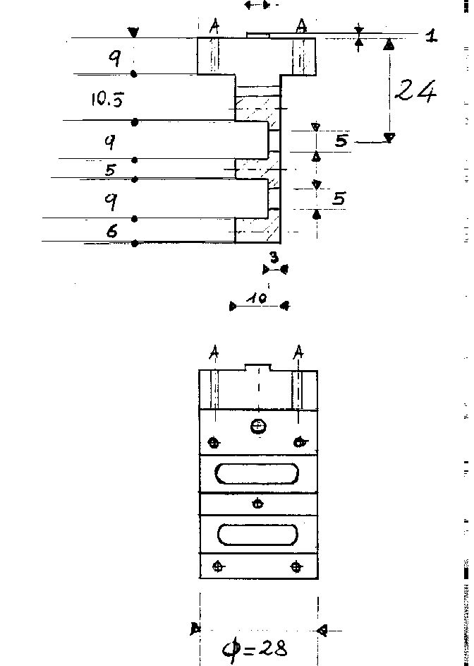 For what concerns EXAFS apparata, users have the choice between a liquid-helium cryostat (T=4-300 K) and a liquid-nitrogen oven-cryostat (T=77-450 K). The dimentions of the related sample holders are shown the pictures below and have to be considered prior to the sample preparation.