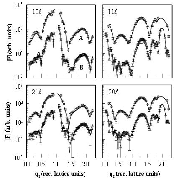 Integrated x-ray reflections were collected at grazing incidence of the incoming beam (=0.68 Å) along four symmetry independent [(10), (11), (20) and (21)] crystal truncation rods (CTR’s). Fig. (1) shows the structure factor amplitudes (|F|) measured up to qz=3.53 Å-1. Circles and triangles represent data points collected for samples (A) and (B), respectively. Standard deviations () represented by error bars were derived from the counting statistics and the reproducibility of symmetry equivalent reflections. In general, these were found to be in the 7% range.