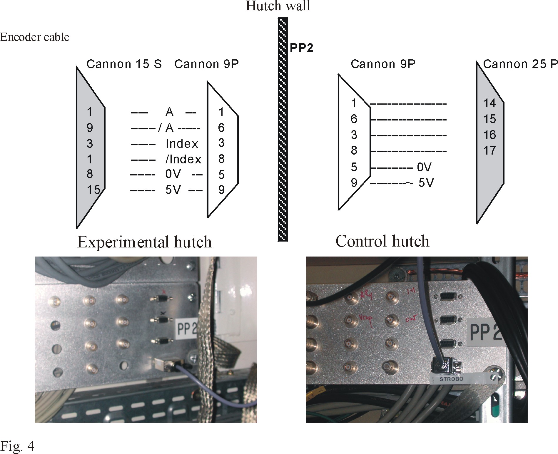 The encoder has 500 steps per turn, i.e. per 360 degrees. It delivers signal each time the index passes (once per turn). The encoder cable description with the real connection in the Experimental and Control hutch respectively on PP2 panel are shown in fig.4.