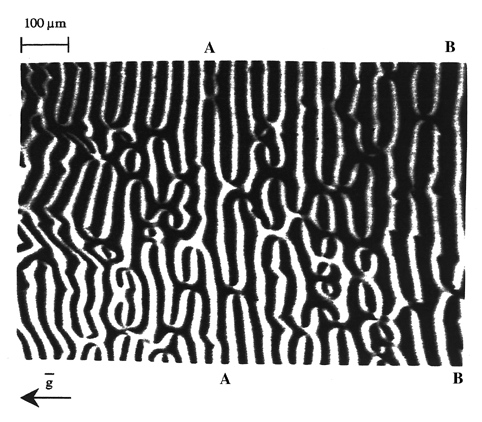 Fig. 103: Magnification of a topograph showing a region of the sample from Fig. 99, but close to the sample edge. It is seen that the dislocation pairs in the layer disturb the Moiré pattern locally but globally do not create additional fringes (the number of fringes between A and B is the same at the lower and upper part of the figure). The distance between the Moiré fringes is about 40 µm, which leads to relative deformations of about 10-5.