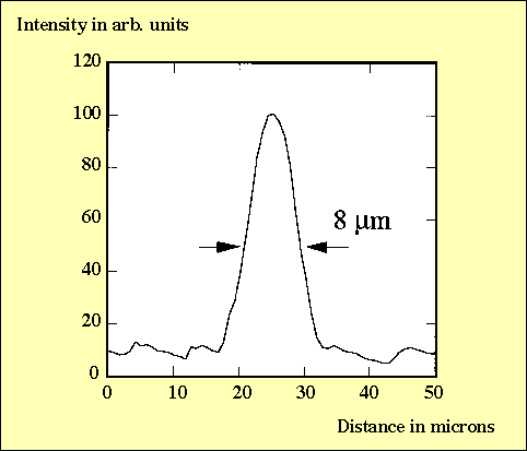 Fig. 95: Measured profile of the focused beam taken at 1.8 m from the CRL. The width of the focal line is about 8 µm, which almost corresponds to the source size of 150 µm reduced by a demagnification factor of 20.