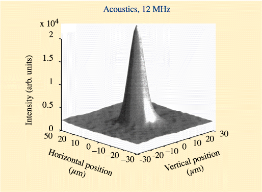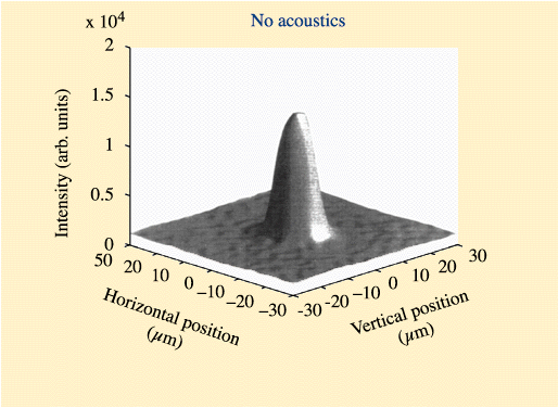 Fig. 98: The 2D mapping of the Bragg-Fresnel lens focal spot intensity distribution obtained by means of scanning with a 10 µm pinhole coupled with a scintillation counter: a) without and b) with acoustic modulation at a frequency of 12 MHz.