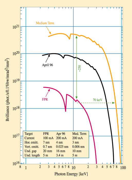 Fig. 88: Brilliance reached in April 1996 compared to the Foundation Phase Report (FPR) specifications. The gain in brilliance is due to the increased ring current, lower emittances, smaller magnetic gap and spectrum shimming performed on the undulators.
