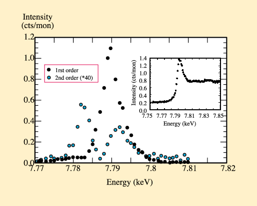 Fig. 24: Energy dependence of the first and second order magnetic harmonics in the spiral phase of the Dy film. The insert shows the fluorescence at the Dy LIII edge.