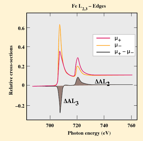 Fig. 26: X-ray absorption and magnetic circular dichroism of iron at the L2 and L3 edges taken with two opposite saturation magnetisation directions (C.T. Chen et al.).