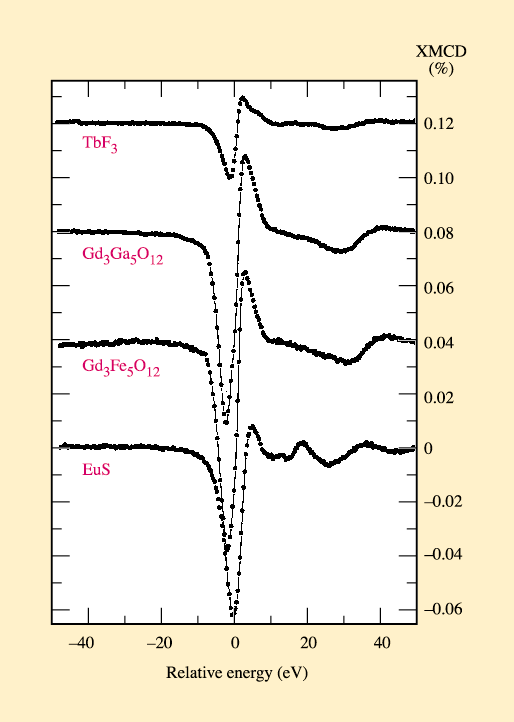 Fig. 30: XMCD spectra of various rare-earth insulators recorded at the L2-edge of the rare-earth absorbing element. The spectra of Gd3Ga5O12 TbF3 were measured in the paramagnetic phase with a high magnetic field (7 T) and at low temperature (<3 K). Note the great similarity of the spectra obtained for the paramagnetic sample Gd3Ga5O12 and the isostructural ferromagnetic compound Gd3Fe5O12.