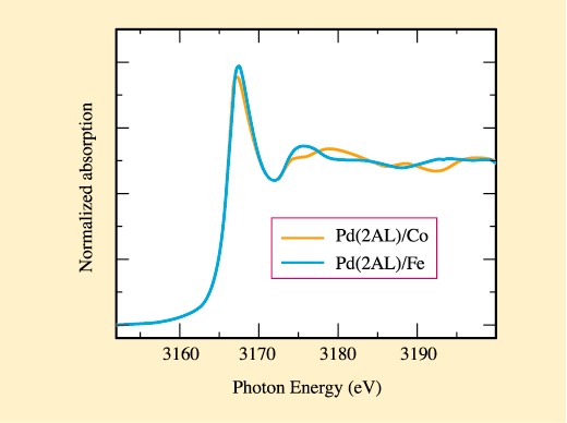 Fig. 31: Comparison between the Pd L3 edge of Pd(2AL)/Fe(8AL) and Pd(2AL)/Co(8AL) multilayers. The fine structure after the white line (3172-3200 eV), which is clearly different for the two samples, depends on the local crystallographic structure around the Pd atoms. The fine structure of the Pd L3-edge in the Pd/Co sample is typical for an fcc local structure.
