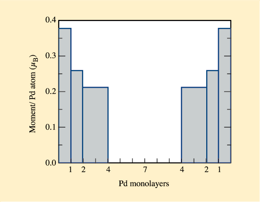 Fig. 32: Magnetic 4d moments of Pd as a function of the distance to the Pd/Fe interface in Pd/Fe multilayers. The results were obtained by combining the average Pd moments found for different Pd interlayer thicknesses.