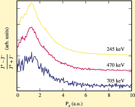 Fig. 36: Magnetic Compton profiles of iron at different incident energies. The scattering geometry is fixed and thus the incident energies of 245, 470 and 705 keV correspond to momentum transfers of 1/5, 1/2 and 1/1 times mc. The integral of the magnetic Compton profiles is decreasing with energy, but the data still have to be corrected with the degree of circular polarisation before the evolution of the cross-section can be followed. The resolution is better than 0.4 a.u. and high-resolution features of the magnetic Compton profile of iron such as a shoulder at low momentum of 0.5 a.u. can be obtained.