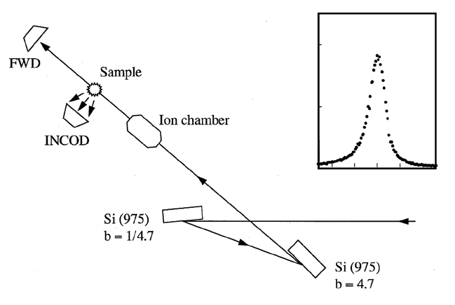 Fig. 47: Set-up for quasi- and inelastic scattering using nuclear resonance techniques. High resolution monochromator with two Si(975) crystals, 1.65 meV bandwidth at 14.4 keV; Sample; INCOD - fast detector system for inelastic scattering; FWD - fast detector system for quasi-elastic and small-angle scattering.
