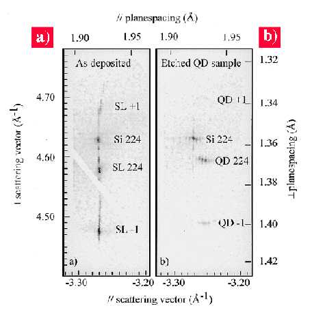 Fig. 42: Overview reciprocal space maps of the region around the 224 reciprocal lattice points showing a clear shift of the layer peaks upon etching. a) and b) show the diffracted intensity distributions from the as-deposited and etched superlattice, respectively. Si denotes the Si-substrate peaks, SL denotes peaks from the as-deposited superlattice, and QD marks the reflections from the quantum dot structure. The order of the superlattice satellite reflections are given by ± 1 in both figures. The left and bottom axes show the scattering vector projected to the directions perpendicular (