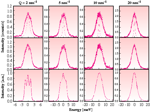 Fig. 51: Selected IXS and MD spectra of neon gas at T = 295 K and 3 kbar at the indicated Q values. (Row a): IXS data (o) at the indicated Q values with their error bars and their fit (solid line). The narrow dashed line, centered at E = 0, is the measured total energy resolution function. (Row b): Comparison between the experimental (o) and MD spectra (solid line), after having taken into account the experimental resolution function and the detailed balance. (Row c): MD non-convoluted spectra.