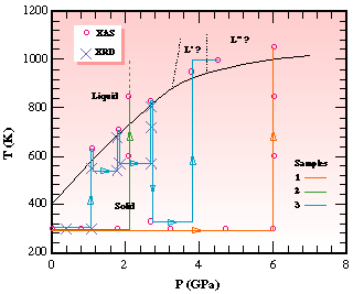 Fig. 82: Iodine phase diagram as suggested by previous determinations and thermodynamic history of the samples measured in the high-pressure, high-temperature experiment.