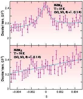 Fig. 61: Upper part: scan along the (1 1 0) direction across the (3/2, 5/2, 0) quadrupolar node at T = 19 k, within the double-k ordered phase of NdMg. The line is a lorenztian fit to the peak. Lower part: scan along the (1 1 0) direction across the (3/2, 5/2, 0) quadrupolar node at T = 78 K, above the Néel temperature.