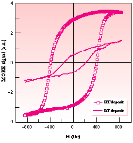 Fig. 65: Magnetic properties of the 20 nm thick Co/NiO films: hysteresis loops, measured at RT by MOKE for the RT and HT (703 K) deposits.