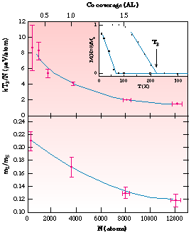 Fig. 67: (a) The quantity kTB/N, a measure of the anisotropy energy per atom versus cluster size. Insert determination of the blocking temperature, TB; (b) The orbital moment per spin (mL/ms) versus cobalt cluster size.