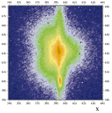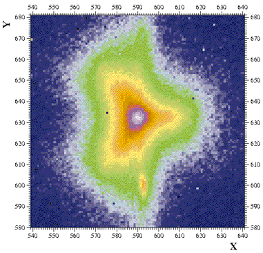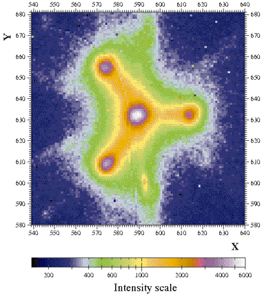 Fig. 85: CCD images recorded during the phase transition. The condensation of the diffuse scattering and its transformation into satellite reflection is clearly visible.Fig. 85: CCD images recorded during the phase transition. The condensation of the diffuse scattering and its transformation into satellite reflection is clearly visible.