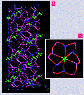 Fig. 94: a) The framework structure of Mu-9. b) Detail of the environment around the octahedrally coordinated Al showing its connection to 6 P-atoms.