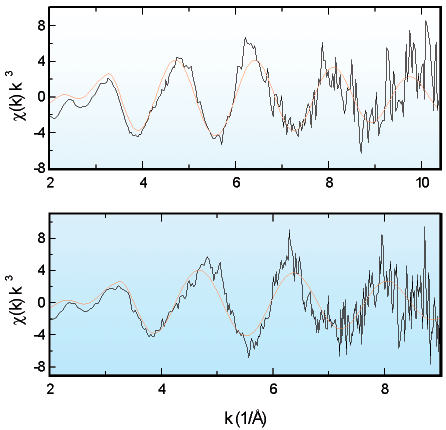 Fig. 32: Cu K-edge k3 weighted EXAFS of 4.4 ppm Cu in 0.7 M NaHS solution at 9.5 pH (top) and of 1.2 ppm Cu in a 0.5 M NaHS solution at 7.4 pH (bottom).