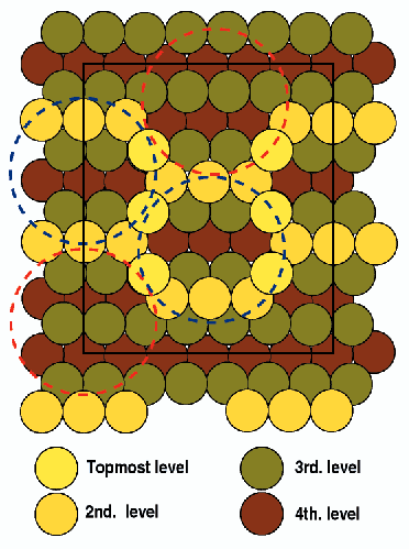 Fig. 41: Top view projection of the Au(110)-p(6x5) surface reconstruction. The relative heights of the Au atoms are indicated by different colours (darker colours represent deeper atoms). The dashed circles are the projections of the fullerene molecules which are ordered in a hexagonal close packed arrangement. By looking at the substrate atoms underneath the central fullerene molecule, one may observe that a total of seven Au atoms have been displaced from their original positions in the substrate (the topmost four atoms plus 3 atoms in the second level) in order to form a cavity to accommodate the fullerene. This indicates an interaction between the fullerenes and the Au surface which is much stronger than through van der Waals forces alone.