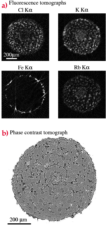 Fig. 6: (a) Fluorescence tomographs of the root of the mahogany plant (Swietenia macrophylla). Tomographic reconstructions (using filtered back projection) of the K-lines for Cl, K, Fe, and Rb are shown. (b) Phase contrast tomograph of the mahagony root, showing the cellular structure.