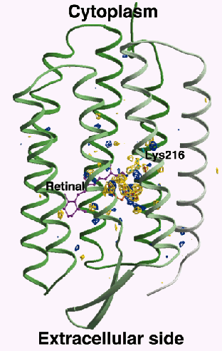 = r.m.s. electron density for the unit cell) and overlaid on the ground state bR model. At this contour level most changes are clustered in the vicinity of the retinal.