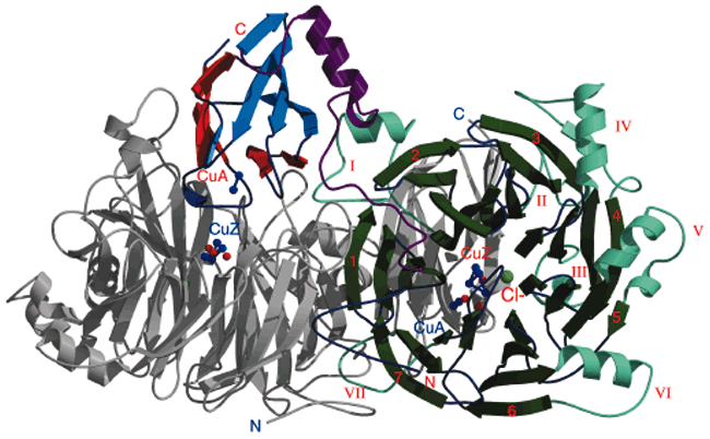 Fig. 15: Overall view of the crystal structure of the N2OR dimer; one monomer is uniformly coloured grey while the other monomer is colour coded as a function of secondary structure. The labels of the coloured monomer (N- and C- termini, the copper centres, Cl ion, blade and insertion numbering) are in red; labels for the second monomer are in blue. Blades are numbered from 1 to 7. Seven insertions are identified: labelled I to VII.