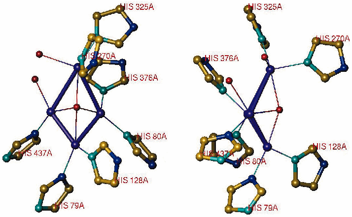 Fig. 16: Side and front representations of the CuZ centre; copper is in purple, OH in red, imidazole rings from the histidines are colour-atom coded, the N1 being dark blue, and the N