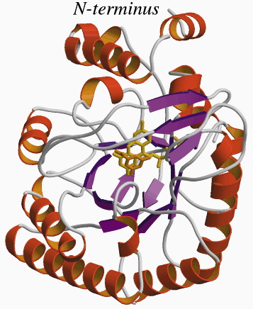 Fig. 17: The structure of the Escherichia coli dihydroorotate dehydrogenase. The protein forms an /ß-barrel with two extra helixes at the N-terminal lying on the side of the barrel, when compared with other DHOD structures. These helixes are proposed to be the membrane associating part of the enzyme. The FMN group and the product orotate are represented as stick models (FMN, yellow; orotate, orange).