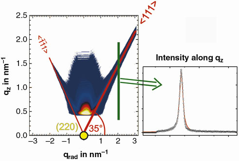 Fig. 155: GIDXS reciprocal space map of the intensity distribution close to the (220) surface reflection caused by extrinsic stacking faults on {111} planes. a) qz points along [001] and qradial along the [110] direction. The intensity along qz is measured by a PSD (green bar). |