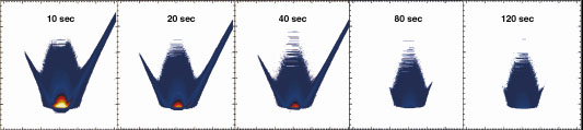 The GIDXS has been developed and used on boron dopant atoms implanted in silicon at higher energies (35 keV). We have demonstrated the strength of the method to follow the defect transformation as a function of annealing treatments [1,2]. In essence, defect clusters consisting of B and Si interstitials of a diameter of about 4 nm are formed after implantation and low temperature annealing. After RTP the clusters dissolve and the corresponding diffuse intensity close to Bragg peaks (Huang scattering) decreases dramatically. The boron atoms become electrically active. The surplus silicon self-interstitials are condensed in extrinsic stacking faults on {111} planes, which produce characteristic intensity streaks along the <111> directions (Figure 155). The width of these streaks perpendicular to <111> is used to determine the size of the stacking faults, the integrated intensity is a measure of the number of self-interstitials bound in stacking faults. Depending on the temperature of the RTP, the kinetics of growth and dissolution of the stacking faults can be monitored by GIDXS as shown in the figure for the case of 1060°C. It is clearly demonstrated that within a short time-window of only 80 seconds the stacking faults grow and disappear almost completely (Figure 156).