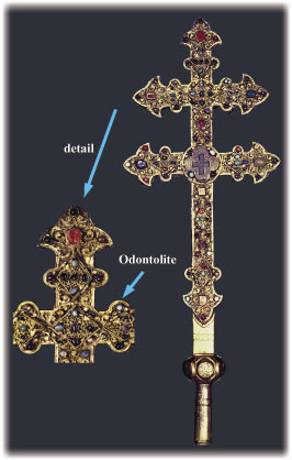 In the Middle Ages, Cistercian monks created odontolite, a turquoise-blue gemstone, by heating fossilised mastodon ivory found in 13 - 16 million year old Miocene geological layers next to the Pyrenees. They thought they had produced the mineral turquoise because of the resemblance of odontolite with this semi-precious stone. Odontolite was therefore used for the decoration of medieval art objects such as the reliquary bronze cross shown in Figure 43.