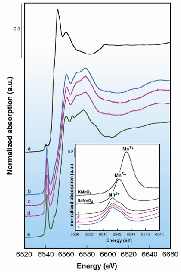 Fig. 44: Mn K-edge XANES spectra of: (a) fossilised ivory; (b) 600°C heated fossilised ivory; (c, d) turquoise-blue collection odontolites and (e) synthetic apatite Ba5(PO4)2.5(MnO4)0.5Cl taken as reference mineral with Mn5+ in tetrahedral coordination. Inset: Pre-edge structure of tetrahedral Mn5+ in (b) heated fossilised ivory; in (c, d) odontolites and in (e) synthetic Ba5(PO4)2.5(MnO4)0.5Cl, are observed at 0.9 eV and 1.9 eV below those of tetrahedral Mn6+ in BaMnO4 and Mn7+ in KMnO4, respectively. |