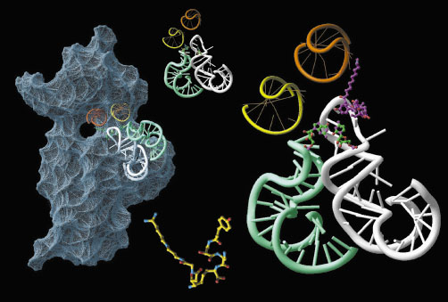 Fig. 10: (Left) The small ribosomal subunit. The mRNA path and the P-(orange) and E-(yellow) sites are shown. The RNA features that are "frozen" by edeine are highlighted in white and cyan. In the assembled ribosome the large subunit will face the left side of the particle. (Middle) top: the free edeine binding site. Bottom: the structure of edeine. (Right) Detailed view of edeine (purple) binding site. Note the newly formed base pair (green). |