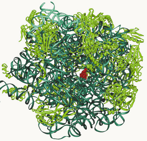 Resistance to antibiotics is a significant problem in modern therapeutics. Ribosomes of pathogenic bacteria are major targets for antibiotics. Ribosomes are a cellular organelle catalysing the translation of genetic code into proteins. They are protein/RNA assemblies arranged in two subunits that associate for performing protein biosynthesis. The large subunit (1.5 megaDa, 3000 nucleotides in two RNA chains and ~35 proteins) creates the peptide bonds and provides the path for emerging nascent proteins. The smaller subunit (0.85 megaDa, 1500 nucleotides in one RNA chain and ~20 proteins) has key roles in controlling the fidelity of codon-anti-codon base-pairing and in initiating the biosynthetic process.