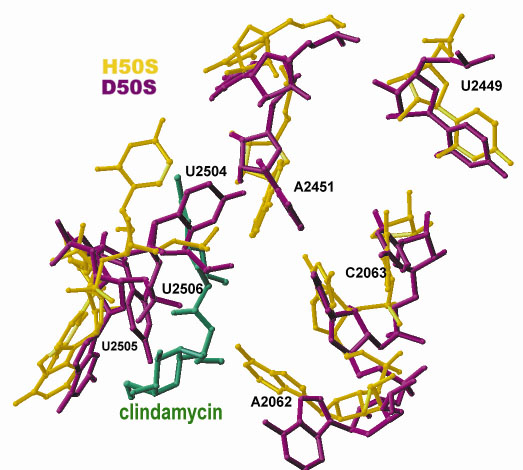 Fig. 12: Clindamycin binding site shown on a superposition of the backbone of the peptidyl transfer ring of a eubacterial pathogen model (D50S) and of its archeal counterpart (H50S) which serves as a model for eukaryotes (E. coli numbering scheme). |