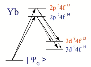 Fig. 60: Total energy level scheme for an Yb ion in YbAgCu4. The arrows indicate the relevant XAS and RIXS transitions.