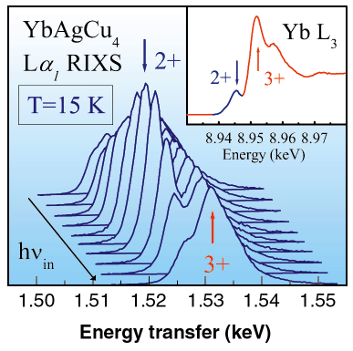 Fig. 61: RIXS spectra of YbAgCu4, excited along the Yb2+ feature of the XAS (inset). The 2+ feature is resonantly enhanced in the RIXS spectra.