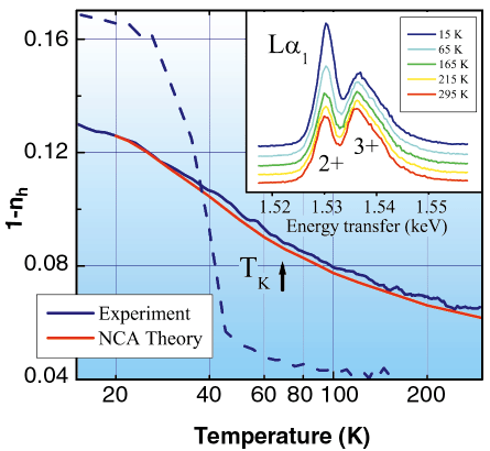 Distinct 2+ and 3+ features are observed both in absorption (XAS) and RIXS spectra (Figure 61). They are resonantly and separately enhanced when the excitation energy hin is swept through the Yb L3 absorption edge. When the excitation energy is tuned to the 2+ XAS feature, the signal from the minority Yb2+ configuration dominates the spectrum. We followed continuously the temperature evolution of this signal. Its intensity, proportional to (1 - <nh(T)>), exhibits a 100% variation from 0.13 at 15 K to 0.065 at 300 K (Figure 62), revealing the existence of the underlying Kondo scale. The experimental curve is accurately reproduced by a calculation performed within the non-crossing approximation (NCA) for the Anderson Impurity Model (AIM). The fit yields a Kondo temperature TK = 70 K, which agrees well with indirect estimates from magnetic and thermodynamic data. For comparison, we show in the same figure the results of an analogous RIXS measurement on the isoelectronic compound YbInCu4. This material exhibits a first-order valence transition (from 2.96 to 2.83) at TC = 42 K, and therefore is not a typical Kondo system. As expected, the intensity of the 2+ signal suddenly drops at TC.