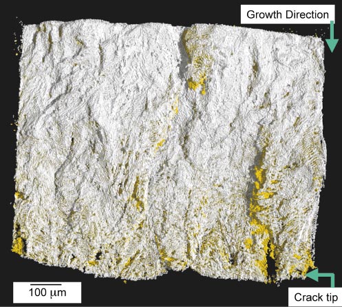 Tomography results have been used for both direct imaging of crack paths and 3D image analysis to extract the crack volume. Figure 91 shows 3D crack volumes extracted in the loaded and unloaded conditions, rendered and viewed perpendicular to the crack plane. The white layer represents the unloaded crack, superimposed over the same crack at maximum load in yellow. As representations of the crack volume in each case, discontinuities in the surfaces represent either unbroken ligaments in the crack wake, or regions of fracture surface contact. The regions appearing in yellow clarify areas in the crack wake that have gone from a closed to open condition on loading. Such results identify distributed, relatively small points of contact close to the crack tip (of the order of 10 µm across), and large contact areas (of the order of 100 µm) occurring to greater distances behind the crack tip. The larger contact areas and their apparent association with ridges running parallel to crack growth direction is consistent with previous reports, whilst the distribution of small contact points approaching the crack tip has not been seen previously. Quantitative assessment of contact areas has confirmed the progressive nature of closure processes during crack loading and unloading. This highlights the intrinsic simplification and deficiency involved in the widespread use of a single valued closure point to quantify crack driving forces.
