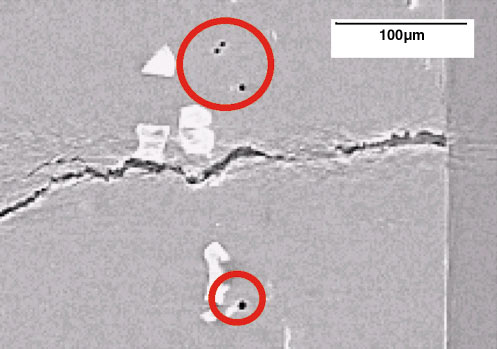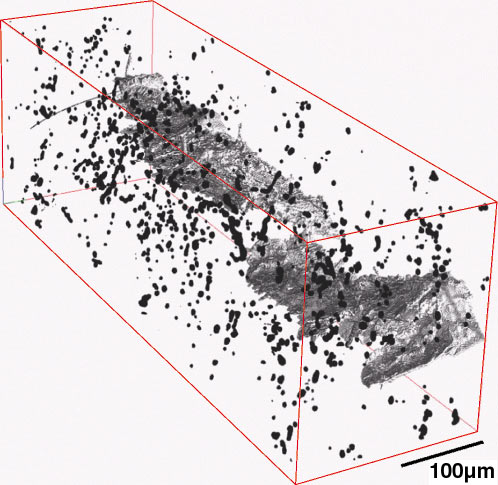 Fig. 92: Two-dimensional slice of a tomographic reconstruction showing crack and fine porosity used to quantify local deformations. |