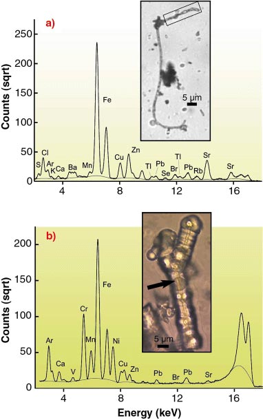 SXRF spectra of filamentous bacteria and microfossils contain X-ray peaks of Ca, Ba, Mn, Fe, Cu, Zn, Pb, Br and Sr. In addition to these, Cr and Ni has been detected in the fossil microfilament and S, K, Tl, Se and Rb in the microbial filament. Owing to the high absorbance of the siliceous envelope, only a weak X-ray peak of sulphur was identified in the fossil filament. The origin of S, Tl and Se and possibly that of Mn, Fe, Cu and Zn, may be attributed to the microbe metabolic activity. In contrast, Cl, K, Ca, Ba, Br, Rb and Sr are most likely derived from seawater.