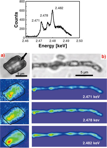 Micro-XANES spectra (Figure 106) show three main types of sulphur with X-ray peaks at 2,471, 2,478 and 2,482 eV. The marked peak at 2,482 eV is characteristic of sulphate. The peaks at 2,471 and 2,478 eV are typical of sulphide or SH amino acid groups, or both. Mapping of the different forms of sulphur performed at energies of 2,471, 2,478 and 2,482 eV revealed different distributions of sulphates, sulphides and amino acid-SH groups. Recognition of a heterogeneous overlap of sulphides and SH-radicals strongly suggests that the two sulphur components are present in the same filament. In both types of filaments, the occurrence of three main sulphur species showing heterogeneous distribution on a filament scale and locally underlining the shape of individual bacteria (microbial filament), strongly suggests that the original microorganisms were actively metabolising sulphur. Despite uncertainties on the metabolic capability of the bacteria that produced the filaments studied here, these results show the potential of combining high-resolution SXRF and micro-XANES techniques for extracting unequivocal biogenic information from fossilised hydrothermal systems or extraterrestrial material.
