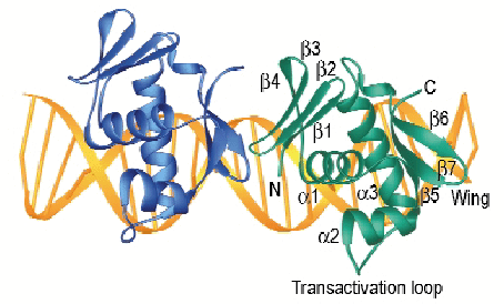 Fig. 6: Ribbon representation of the PhoBE in complex with the pho box DNA. Two PhoBE protomers are bound in tandem along 22 base pairs of DNA. |