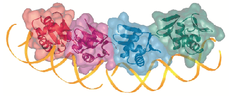 Fig. 7: Structure of a tetramer of PhoBE bound to two consecutive pho boxes, superimposed with the transparent molecular surface of the protomers, as formed by crystallographic contacts in the crystal structure. |