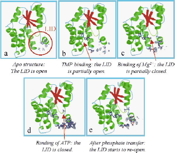 Crystallisation of TMPKMtub using sodium malonate as precipitating agent and initiation of catalysis in the crystal by diffusion of ATP allowed us to elucidate the structures of (i) the apo-TMPKMtub (Figure 8a), (ii) the complex TMPKMtub-TMP (Figure 8b), (iii) the complex TMPKMtub-TMP-Mg2+ (Figure 8c) and (iv) the complex TMPKMtub-TDP-ADP-Mg2+ (Figure 8e). In addition, crystals grown in the presence of ammonium sulphate show a magnesium ion and a sulphate ion in the ATP binding site and provide a good mimic of the complex TMPKMtub-TMP-ATP-Mg2+ (Figure 8d, [1]).