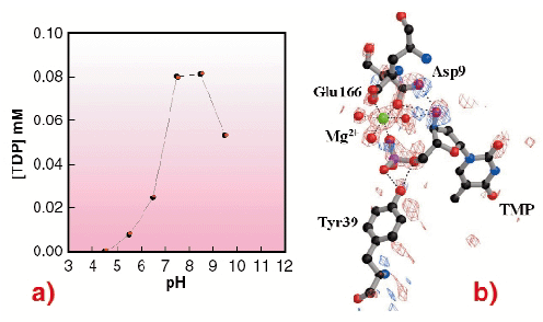 Fig. 9: (a) pH dependence curve of the TMPKMtub catalytic activity. The TDP production (on the vertical axis) is represented as a function of pH (horizontal axis); (b) TMPKMtub active site. Difference electron density map contoured at ± 3.5 |